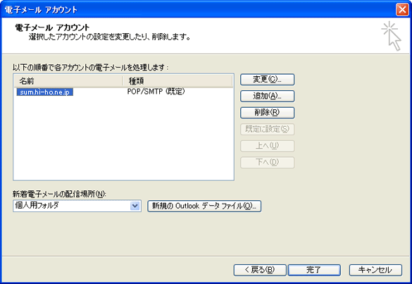 作成したメールアカウントが表示されています。 例) sum.hi-ho.ne.jp