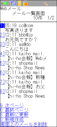メール数が多い場合は複数のページに分かれて表示されます。(下に、メニュー[次ページ]があります一覧から読みたいメールに付いている番号を選択してください。